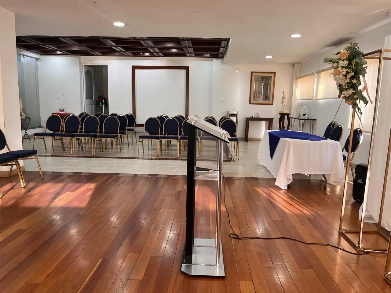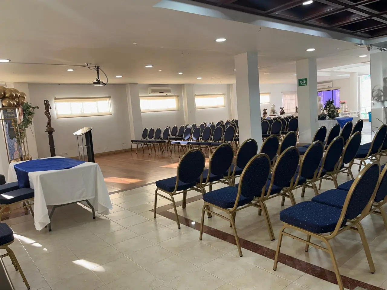 Alquiler del Salón con sillas de lujo, adecuamos el escenario para tu evento, ayudas audiovisuales, aire acondicionado, soporte técnico y operativo, parqueadero, registro del evento y generación de contenidos en espacios instagrameables adaptados para fotografías, videos y entrevistas.